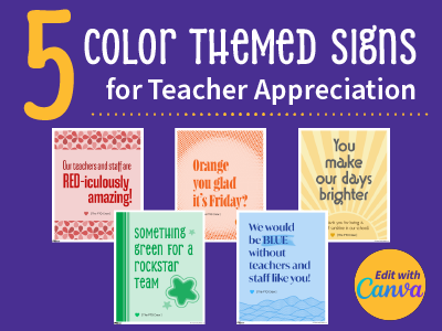 Add a splash of color to Teacher Appreciation Week (May 4 - 8, 2026), homecoming, professional development day or faculty meetings with our free bundle of color theme appreciation signs! Each 8" x 10" sign is editable using Canva and highlights a different color to pair with red, orange, yellow, green, and blue themed snacks and drinks.