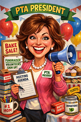 From principals holding giant coffee mugs and walkie talkies (and wearing blinged out crowns) to PTO presidents juggling allll the things—clipboards, popcorn, megaphones and fundraising flyers—these playful AI caricatures have become a funny, lighthearted way to show the reality of what it's like to wear a hundred hats.