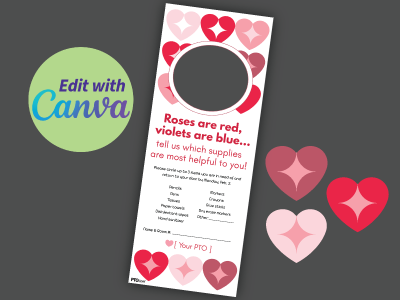 Looking for a thoughtful way to show teacher appreciation this Valentine’s Day? Our free Valentine’s Day teacher appreciation door hanger helps your PTO or PTA give teachers something they’ll truly love: the classroom supplies they actually need!