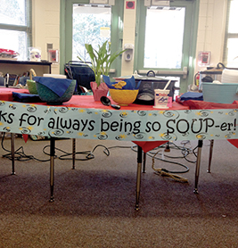 Mountain View Elementary in Marietta, Ga., has a busy teacher appreciation committee, which organizes everything from a dessert raffle to snacks during conference week. For Teacher Appreciation Week, the most popular event is a soup bar, which offers about 10 different soups in slow cookers provided by parents. Volunteers set up a buffet in the media center, and teachers can drop in during their lunch break and help themselves. Parents also provide bottled water with iced tea mix-ins and several desserts. Parents and teachers love the relaxed atmosphere and low-maintenance aspect of the soup bar.