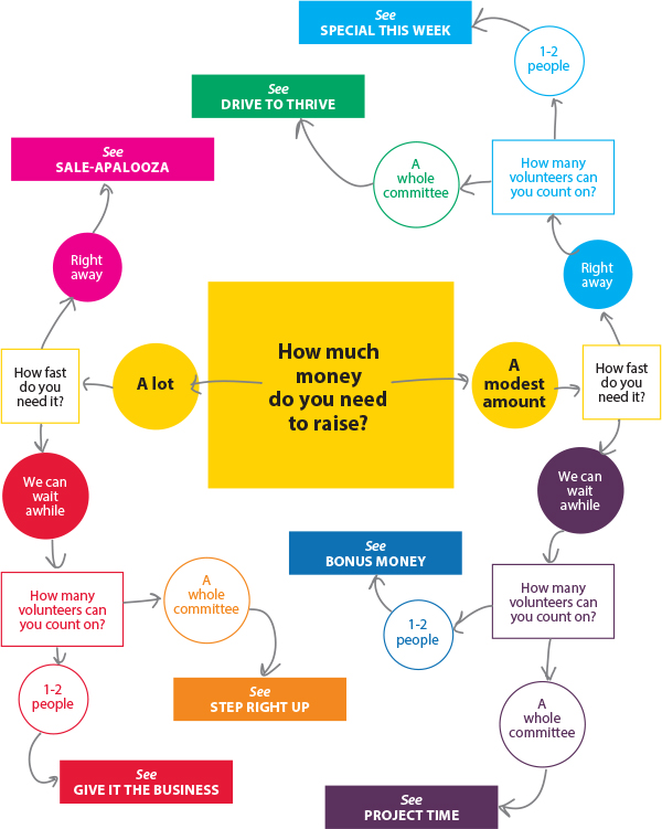 Here is a look at various fundraising choices. Use the chart below to determine which description fits for your particular situation, then read about the fundraising options that fit your needs.