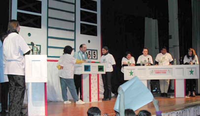As far as the budget is concerned, the Home and School Association happily budgets about $1,000 for Family Entertainment Night. That covers the cost of materials for the set, a CD of the game show’s music, the emcee’s costume, inexpensive prizes for the contestants (usually restaurant gift certificates), the warm-up act (an Austin Powers lookalike in 2002 and the creation of a five-minute video in 2003), and other incidentals. The costs are partially offset by a bake sale that follows the event.