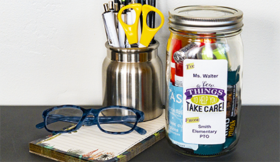 Step 1: Purchase a mug, a mason jar with a lid, or another container large enough to hold a variety of self-care items for teachers.