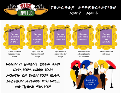 When it comes to appreciation, PTO leaders will be there for you, teachers and staff. Below, we’ve rounded up some of our favorite Friends-theme teacher appreciation files, event supplies, and gift ideas in a convenient shoppable list.