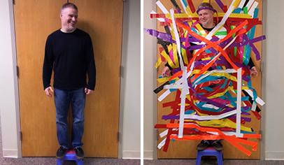 Have a sturdy footstool for your duct-tape volunteer and test it to make sure the stool is comfortable (you don’t want his feet hanging off it), will hold his weight, and can be positioned close to the wall.