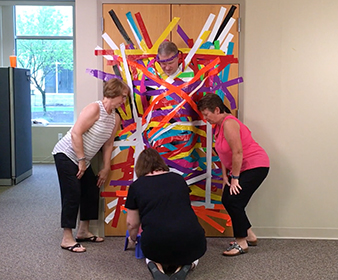 We recommend cutting at least a few dozen strips of tape ahead of time. You can line them up along a table or other surface. If you have pieces ready to go, you’ll avoid a log jam of participants.