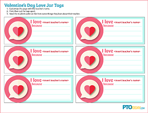 Give your teachers an extra-special Valentine’s Day treat by purchasing a pretty box or jar and having students write why they love their teacher with these Valentine’s Day love notes.