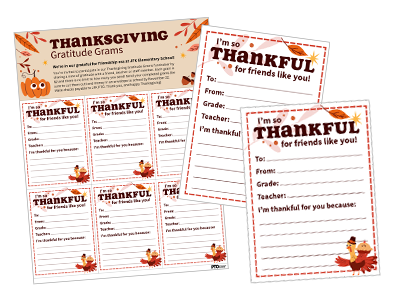 During a school-wide Thanksgiving Gratitude Grams fundraiser, encourage students to share notes of gratitude with friends, teachers and staff members. Your PTO can decide how much to charge for each gram, but we typically see groups charge $1 or $2 per gram, with no limit to how many a student can send. Families send their completed grams and money in an envelope to the school by a specified date. Then, pass out grams the morning before Thanksgiving break (some groups will also include a fall-themed pencil with the gram, too). Our FREE Thanksgiving Gratitude Grams Canva template also includes instructions that you can edit as you see fit for your own school. Happy Thanksgiving!