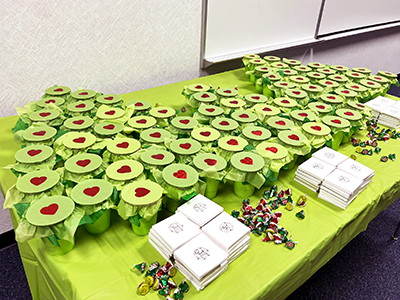Frances E. Norton Elementary PTA in Allen, Texas used rubber bands to secure green tissue paper to green cups filled with Grinch Hershey kisses, mini candy canes, and a special gift. Each cup was then topped with a red heart sticker. (You can get all the supplies on Amazon to make these cute Grinch cups for teachers: green tissue paper, green cups, and red heart stickers.)