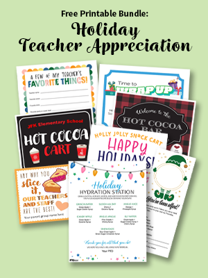 The holiday season is a great time to show your school's teachers and staff just how much they're appreciated. With that much-deserved winter break looming in the distance, your PTO can help your teachers make it to the finish line (with the help of a little hot cocoa, of course). Below, we round up fun and festive ways to celebrate teachers during the holiday season. You can also download our free mega bundle of holiday-themed teacher appreciation printables that includes: