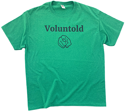 Want to flaunt this look yourself? Get our straightforward “Voluntold” shirt: