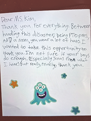 Kim Ludlow says, “My most prized possession is this letter (below). I keep it in my car. And on days when I want to cry, I pull it out and it reminds me why I work so hard.” - Kim Ludlow, PTA President, Sinclair Elementary