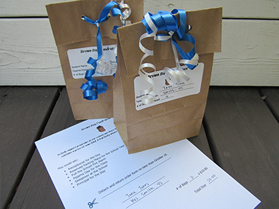 Once orders were collected, volunteers stuffed the bags, sealed them, and then placed stickers on each bag to match the order forms. Since every sack had a prize of some kind, all bags were a similar weight so as not to give away the brown bags with the secret coupons! The bags were distributed to students through the classroom teachers. The students took the bags home to open and share with their families.