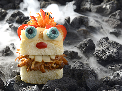 Use your complimentary King’s Hawaiian dinner rolls to serve up some spooktacular snacks! For a great Halloween movie tie-in, make Menehune Sliders (recipe below), featuring the mythical character Menehune from The Legend of Hallowaiian movie. Display the table tent (sent with the rest of the materials) next to your sliders so parents can learn more about King’s Hawaiian dinner rolls, The Legend of Hallowaiian movie, and their chance to win a family trip to Hawaii!