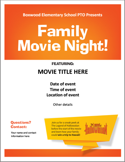 Get families excited about attending your Family Movie Night, the chance to get a sneak peek at the movie trailer for The Legend of Hallowaiian, and the chance to win a family trip to Hawaii! Download our colorful Facebook graphic and flyer below to spread the word.