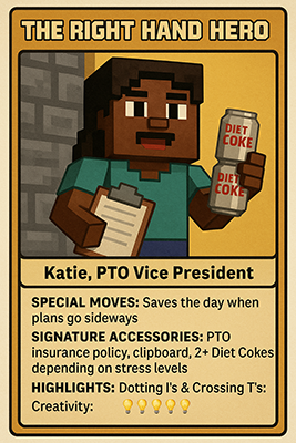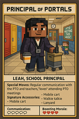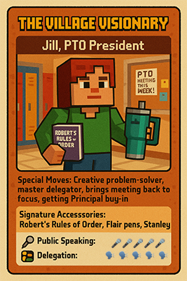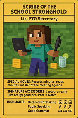 Create a set of 7 collectible trading cards featuring a cartoon characters inspired by the movie Minecraft. Each card should feature a character that is part of the school PTO/PTA group. I will need a card created for the PTO President, PTO Vice President, PTO Treasurer, PTO Secretary, PTO Fundraising Chair, School Principal, and Parent Volunteer. Below is the format to follow for each card. I will supply the custom text for each "character" card. Each card should include the following elements: