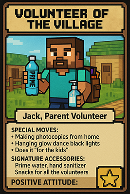 Aligning your volunteer recruitment strategy with current trends is a great way to make your group stand out. Tapping into a trend kids are already tuned into makes your PTO feel fresh and fun, and gets students talking—and when kids think the PTO is *cool*, they’re more likely to tell their parents to get involved (win!). For our Meet the Board theme, we were inspired by the pixelated world of Minecraft, a popular video game and the year's biggest blockbuster movie. Whether you’re honoring the “Mega Money Master” (that's the PTO Treasurer, obvs.) or the “Right Hand Hero” (the PTO Vice President), these custom PTO trading cards are a great way to celebrate the volunteers that keep your PTO running strong.