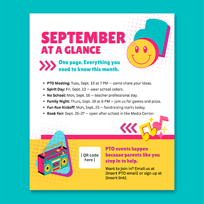 Our free "Month at a Glance" calendar for PTO/A groups makes it easy for parents to stay in the loop (and on the fridge!). Pair this old-school approach with a few smart practices (like clear volunteer asks) to help cut through the digital noise and keep parents engaged.