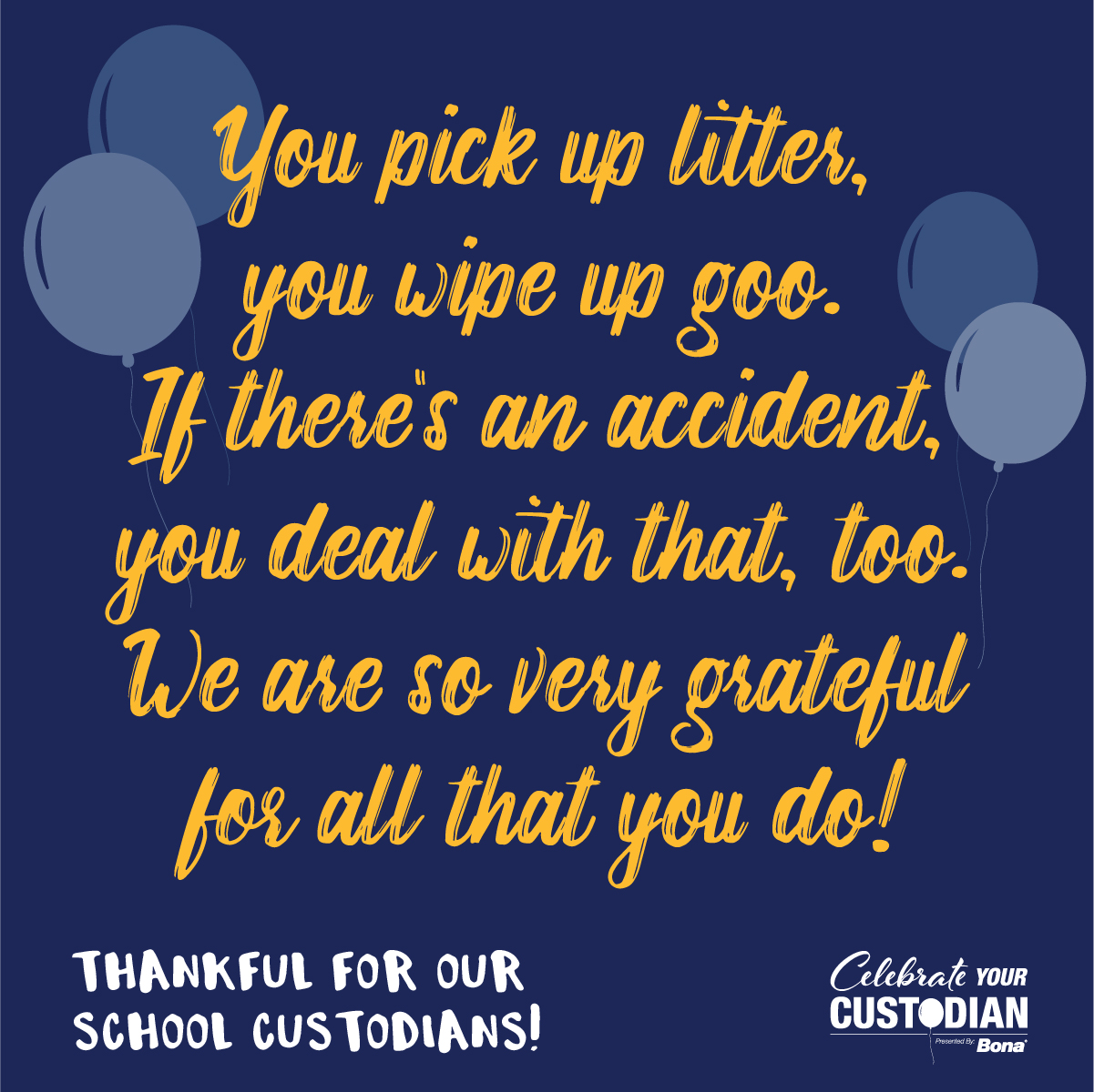 Then, encourage parents at your school to vote between Nov. 8 and Nov. 12. Three schools will win. Winners will be announced by Nov. 17. To encourage parents to vote for your custodian, share our “thankful for our school custodian” graphic (click below to download) on your group or school Facebook page Nov. 8-12 along with this customizable text: