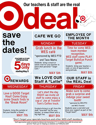 Jamie Gordon, PTO President at Wilsonville Elementary School in Wilsonville, Alabama, shares what her PTO did to make their school's Teacher Appreciation Week unforgettable by making it all about Target...literally. And—get this—their PTO was allowed to borrow Spot the dog from their local Target to use as a centerpiece display in the teachers' lounge. (Lesson: it never hurts to ask, especially if you're on the PTO!). Check out the linked Target-themed supplies and decor below, along with Wilsonville PTO's Target Teacher Appreciation Week itinerary Canva template. We promise this fun Target theme will give your teachers all the feels...ahem, we mean deals!