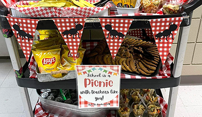 Led by copresidents Whitney Jones Marler and Kayla Bomhard, the PTO hopped on the treat trolley train in 2021 to bring a little comfort and joy to teachers during the pandemic, and the idea just stuck. (It’s safe to say teachers like their snacks!) Now, each month’s cart features a different theme and smorgasbord of treats. PTO goals, right?