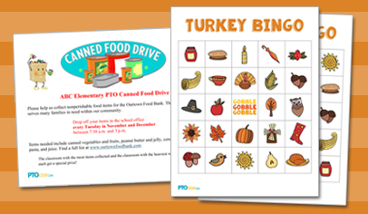 Turkey bingo is a fun variation on typical bingo events that can get families excited at the prospect of winning a holiday meal. The PTAs at Forest Lake and Forest View elementaries in Forest Lake, Minn., jointly pulled together their first turkey bingo night last year in only three weeks. In that time, organizers got permits to hold the event and researched bingo cards, daubers, and concessions before asking businesses to donate turkeys (each turkey was labeled with the donor’s name). They also asked parents and businesses to donate pies for a live pie auction. In all, they were able to get more than 20 pies, a grocery store gift card, and enough donations and sponsors for 18 frozen turkeys. In addition to the bags of food the PTA assembled to give away at the event, enough was left over to donate to a school family in need.