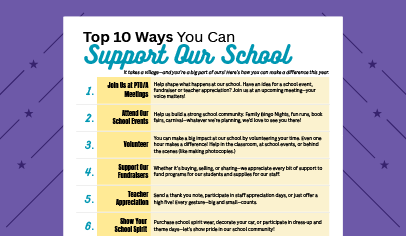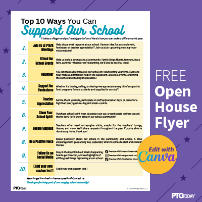 There are so many simple and meaningful ways for parents to get involved at school—and not all of them require a ton of time. From attending PTO meetings to participating in school fundraisers, this list of the Top 10 Ways to Support Your School is packed with ideas that inspire parents to pitch in. Share this customizable flyer with parents at open house or meet the teacher night to help families feel welcome and ready to pitch in.