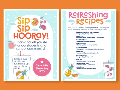 If you've spent time going down the rabbit hole of teacher appreciation on TikTok, it's likely that you've discovered #WaterTok, the trend of flavoring water with syrups and flavor packets to make water taste, well, less like water and more like something fun. Some PTO groups have taken this suped up hydration station straight to the teachers' lounge, where staff can have a little fun mixing up their midday drink of choice. The way it works is simple: display drink recipes, a variety of flavored syrups and drink mix packets, ice, and 2.5 gallon jugs of water. Provide cups or ask teachers to bring their own. Below, you can find a convenient shopping list of everything you'll need, along with a free set of teacher appreciation printables that includes a "Sip Sip Hooray" sign and "Refreshing Recipes" that you can edit or add to.