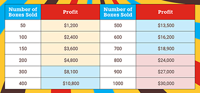 What would your group do with thousands of dollars? With World’s Finest Chocolate, you earn between $24 and $30 profit per box. That means if your school sells a total of 300 boxes, that’s a quick profit of just over $8,000 (sweet!) World’s Finest Chocolate even has a handy online calculator you can use to estimate how much profit your school will earn based on number of boxes sold.